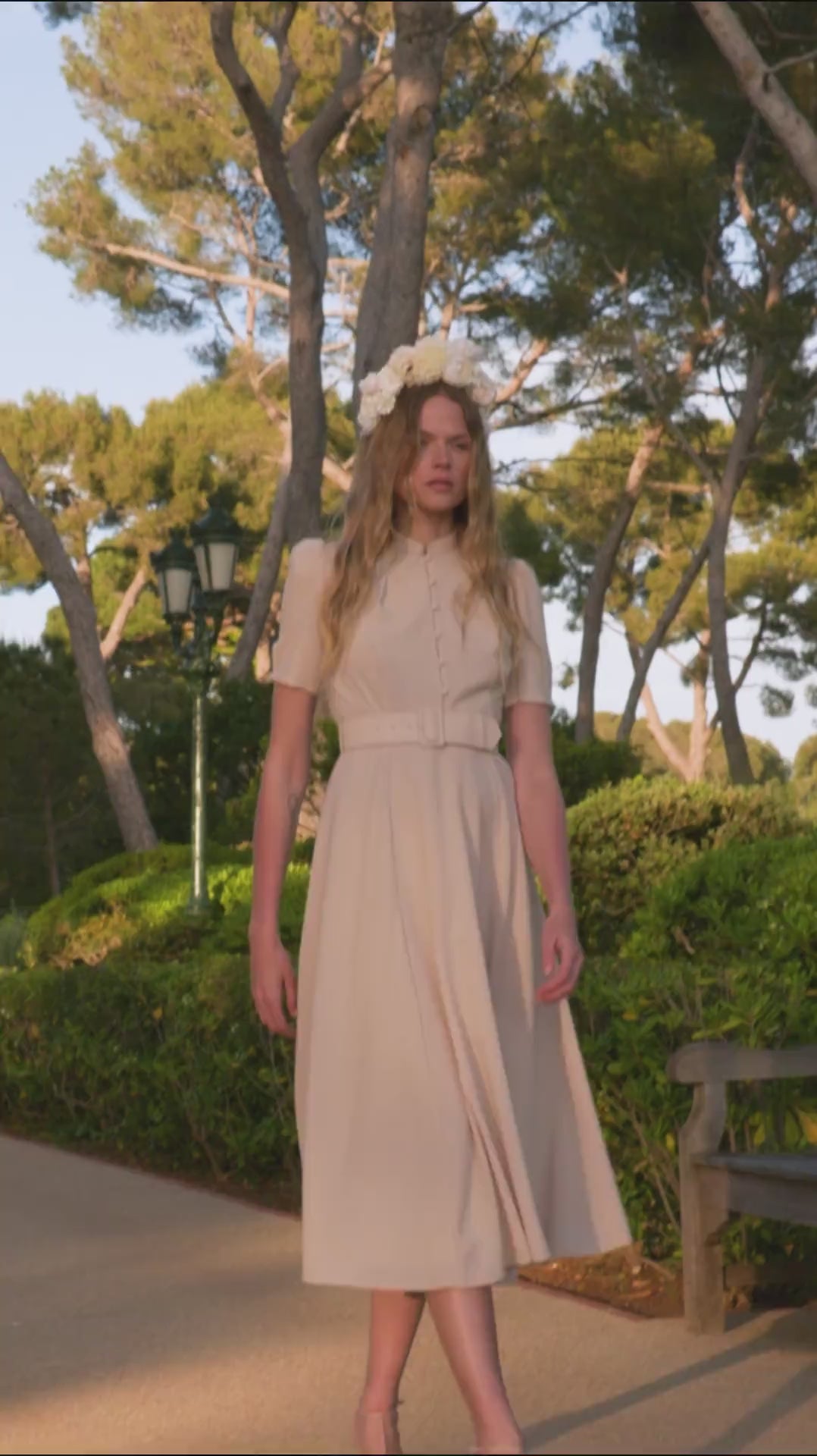 The Ahana Dress in beige is a classic, wardrobe must-have. Crafted from a beautiful creamy beige wool crepe, this dress has a full skirt and tailored bodice.