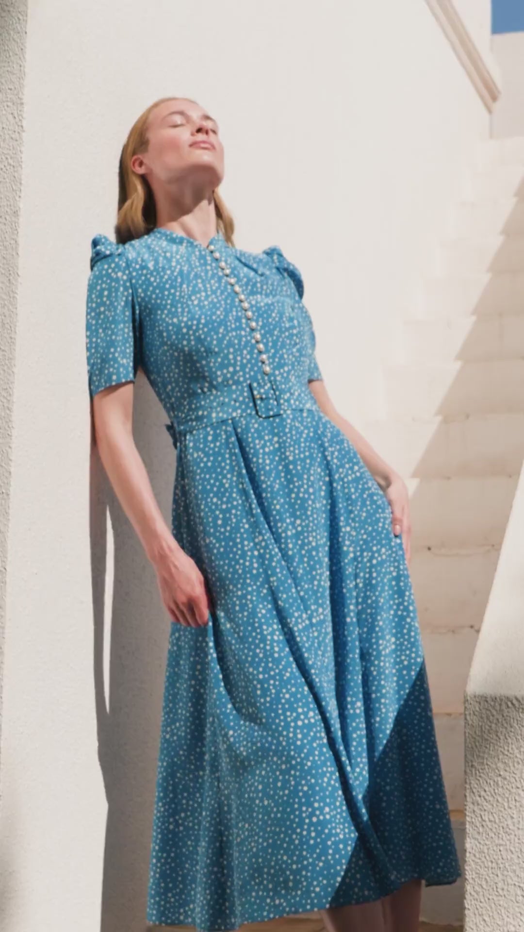 NEW for this season. Our bestselling Ahana dress debuts in a beautiful blue polka dot silk crepe de chine fabric. An elegant choice for summer, designed in our classic Ahana fit with slightly more drama in these pretty puff sleeves. Shaped to a fit and flare silhouette with a short stand neckline, cropped sleeves and sweeping skirt that's belted at the waist for a figure-defining fit.