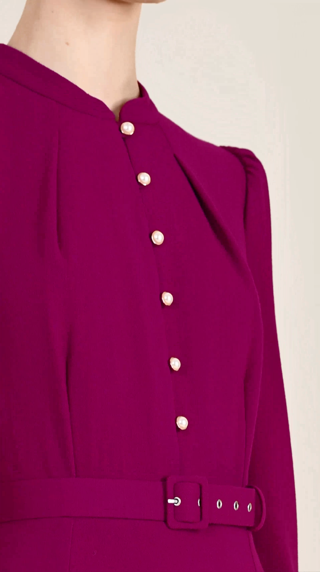 The Ahana Dress in purple is a timeless addition to your wardrobe, crafted from luxurious purple wool crepe. This elegant design features a full, sweeping skirt and a tailored bodice, creating a sophisticated fit-and-flare silhouette. Fully lined for comfort, the Ahana Dress is accented with a charming button-front detail, a short stand neckline, and a belted waist to define your figure. Perfect for any season, this dress blends classic style with modern refinement, making it a must-have for your collection.