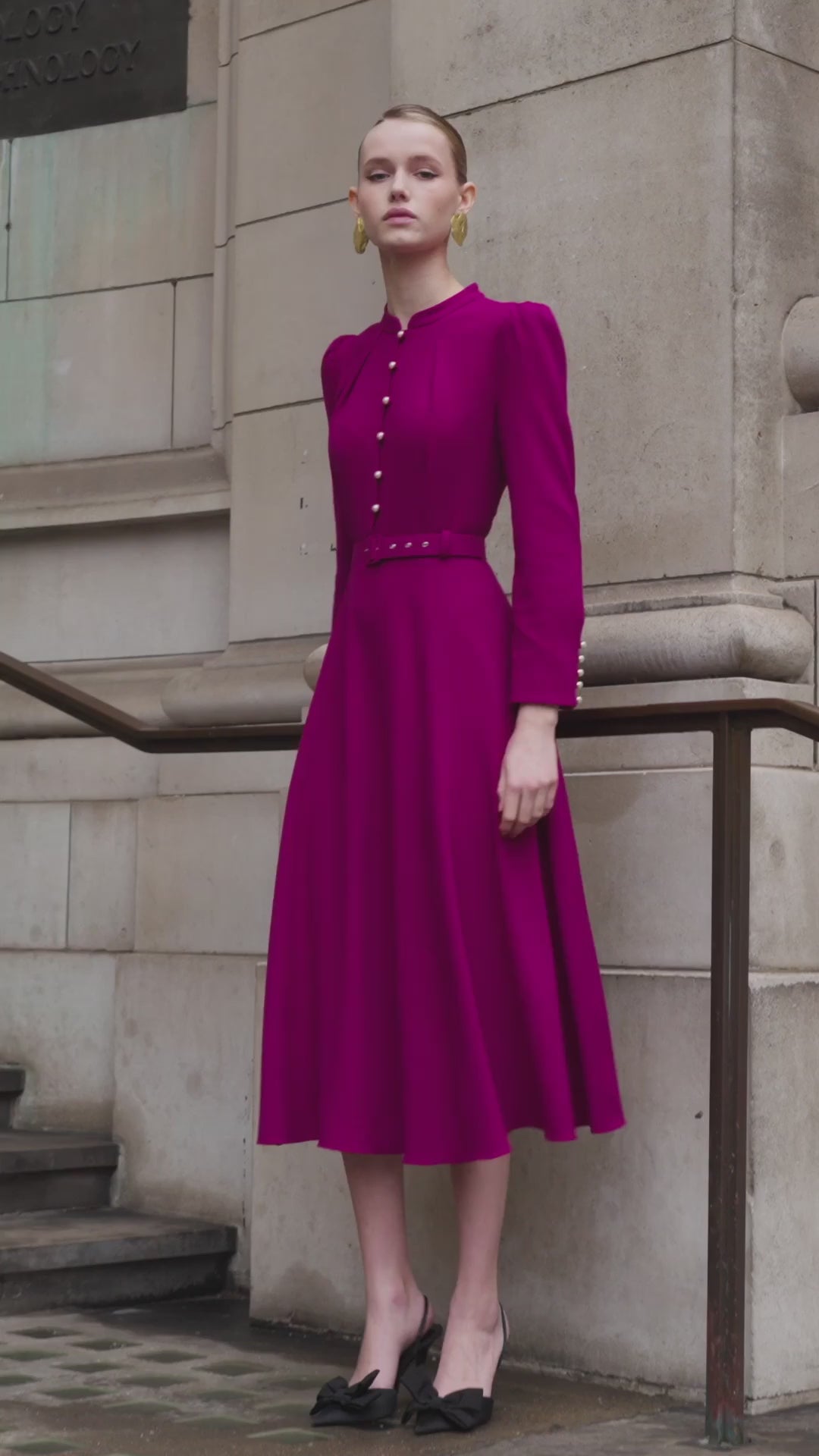 The model wears a UK size 8 and is 5'10. The Ahana is very true to size. There is darting through the waist to create a fitted look, with full volume through the skirt. Entry into the dress is via a side seam and functional buttons at the front.