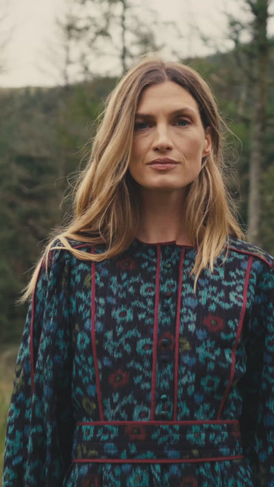 IMPACT STORY: The Evelyn Dress features an IKAT print crafted in collaboration with one of our Impact partners. This traditional fabric is created using a resist dyeing technique, adding a unique, artisanal touch. Each Evelyn dress is finished with a hand blanket stitch and is hand-loomed woven. This dress provides 30 hours of employment, a perfect blend of craftsmanship and sustainability.