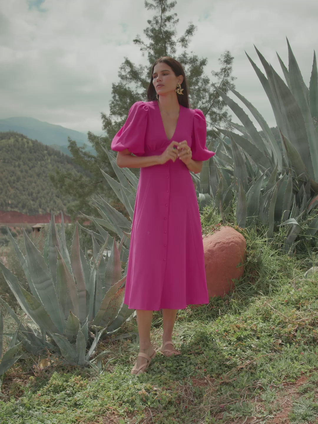 Meet the Francine - a chic, modern dress that is sure to make a statement in a hot pink shade. Crafted from elegant wool crepe, this style features an elegant V neckline, charming puff sleeves and is fully lined. Ideal for mastering a summer of events, the bold pink shade adds a playful touch to a sophisticated and timeless silhouette.