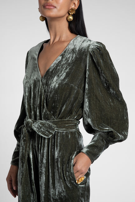 Your go-to party style for the upcoming festive season, the Maisie Velvet Jumpsuit in Moss Green is a relaxed-fit jumpsuit featuring a faux wrap front and tie at the waist for your desired silhouette. Crafted in a glamorous mossy green velvet, the Maisie has a slight flare to the leg and is designed to work with heels or flats. We love its understated elegance.