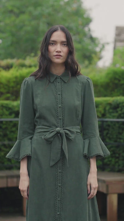 Our best-selling Nalini dress is now available in modern khaki green, perfect for every occasion. Crafted from 100% soft-to-touch cotton corduroy, this midi dress features a new and improved fit for the season. The cropped silhouette, delicate sleeves, and collar make it an ideal choice for everyday wear. Designed for comfort, the relaxed fit through the bodice and hip transitions into a flattering A-line skirt, enhanced with darting for a beautiful shape. Elegant loop trims on the cuffs and bodice add a touch of sophistication to this versatile wardrobe staple.