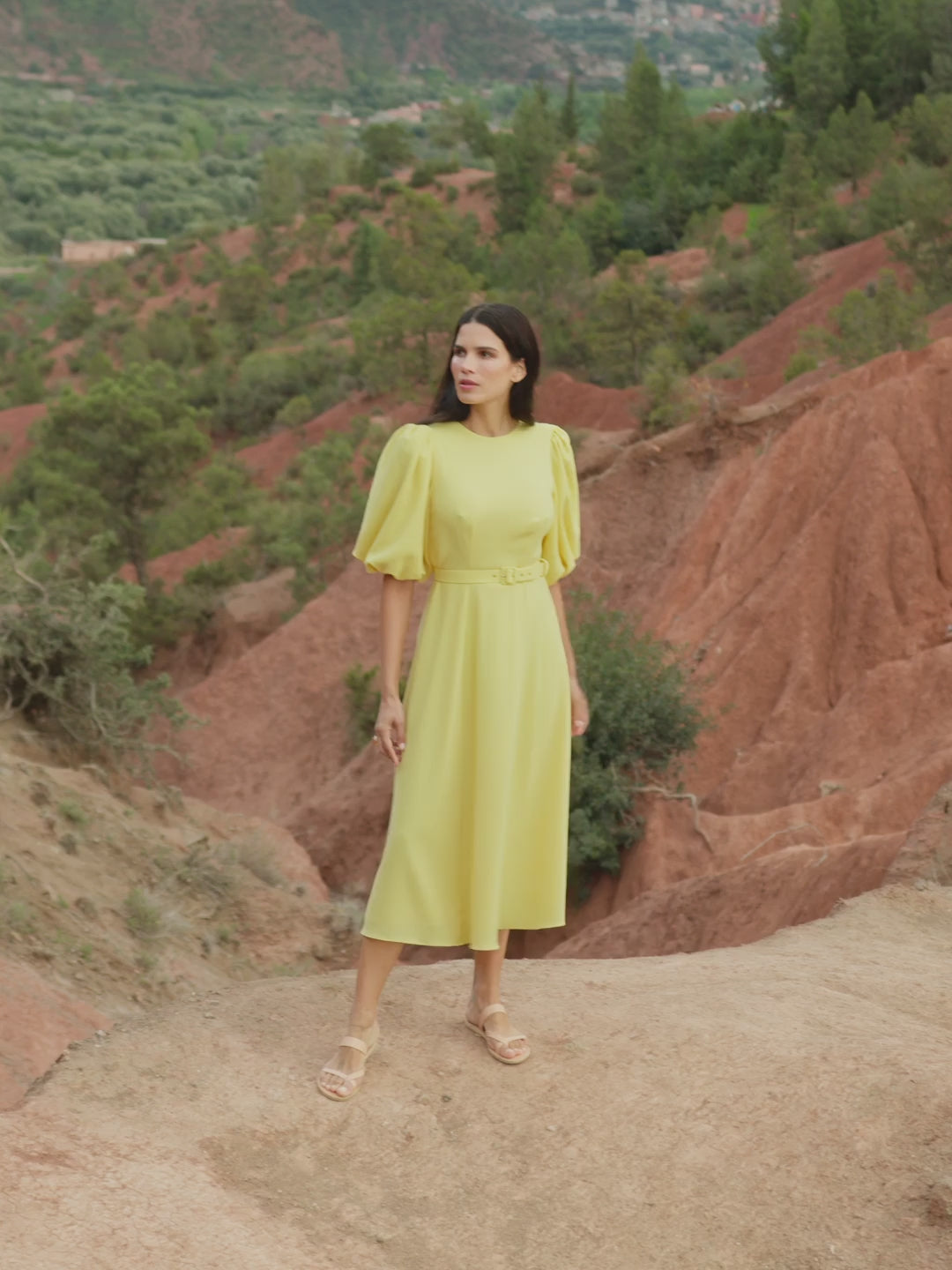 The Sienna in lemon is a midi-length dress with short puff elasticated sleeves for easy adjustment and a high neckline. Fitted through the bodice and waist, this sweet summer shade is the perfect pop of colour for your next event. Designed with a super flattering shape, accentuated by the hardware belt. We love the a-line skirt giving a glamorous volume on this beautiful wool crepe style. We predict a bestseller status.