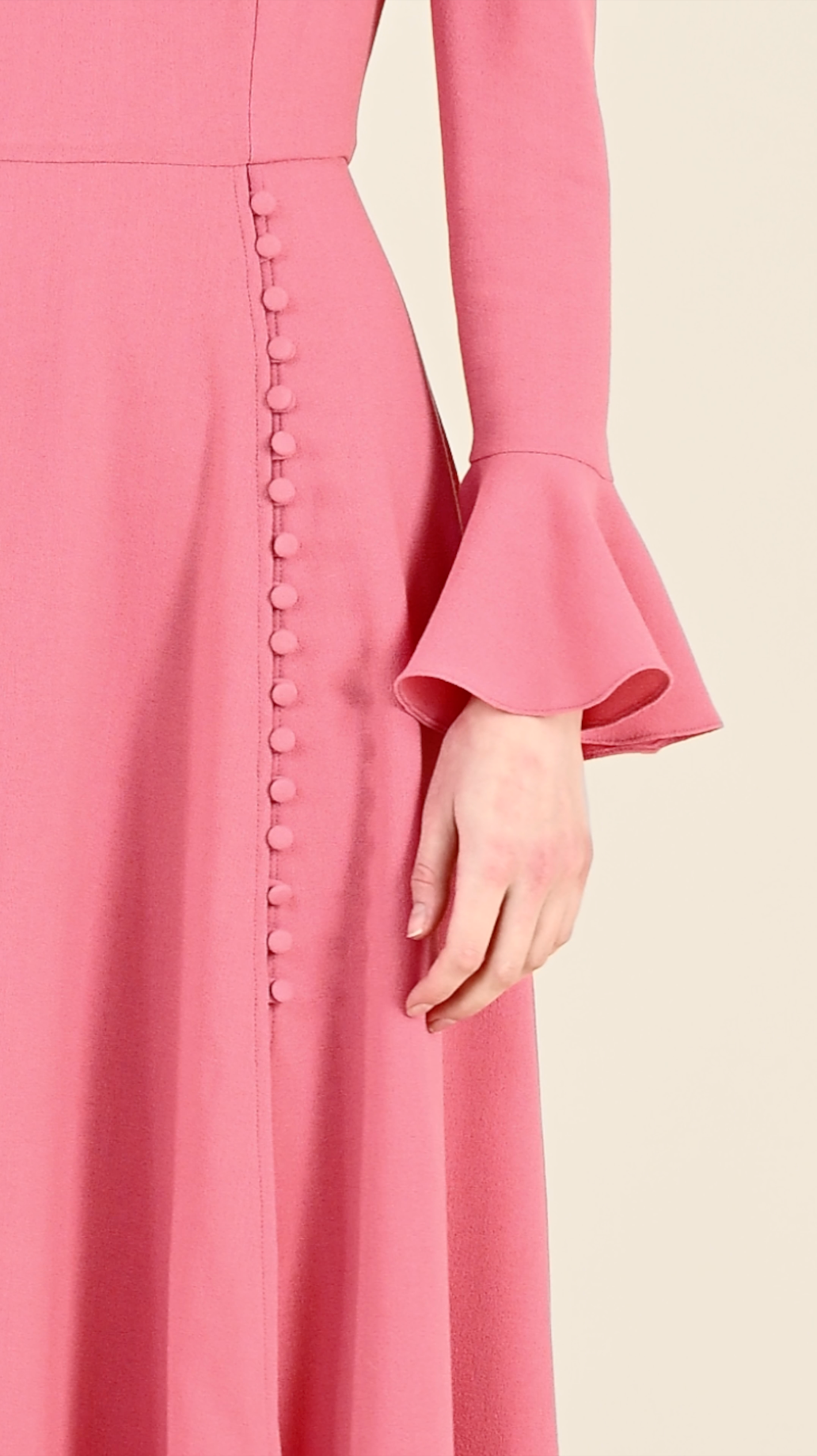 A Beulah classic, the Yahvi Dress returns in a stunning new dusky pink wool crepe for this season. Perfect for special events, this elegant midi-length dress features long, fluted sleeves and a flattering fitted bodice with a round neckline. The flowing A-line skirt is beautifully accented with covered buttons, combining timeless sophistication with a modern touch.