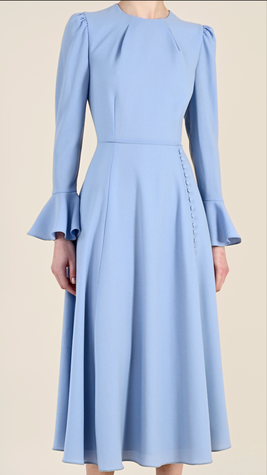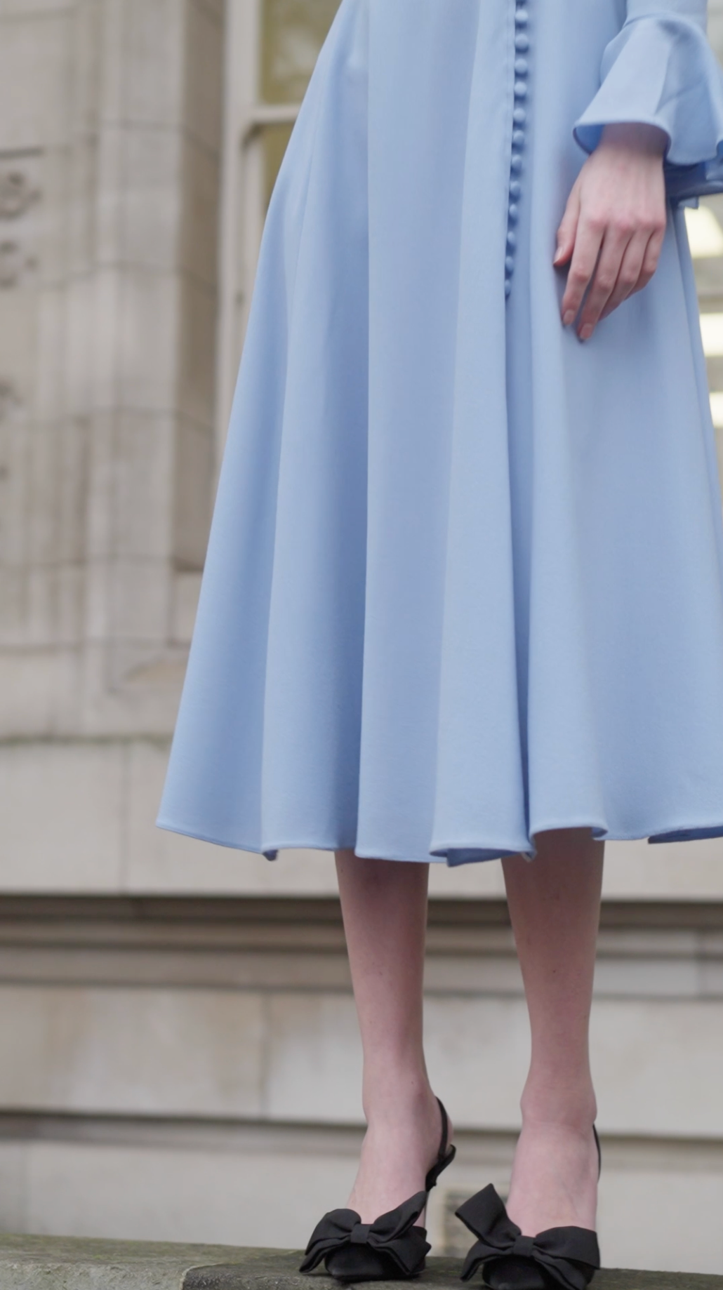 A Beulah classic, the Yahvi Dress returns in a stunning new pale blue wool crepe for this season. Perfect for special events, this elegant midi-length dress features long, fluted sleeves and a flattering fitted bodice with a round neckline. The flowing A-line skirt is beautifully accented with covered buttons, combining timeless sophistication with a modern touch.